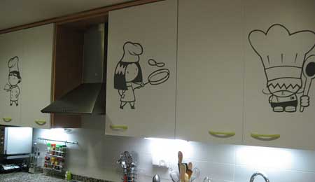 – Los vinilos adhesivos están en pleno auge, y aunque el lugar favorito de todos es ponerlos en las paredes, te quedaran perfectos en los muebles de cocina. Puedes decorarlos con un toque muy divertido y dotar a toda la cocina de un ambiente completamente renovado. Utiliza dibujos o textos relacionados con la cocina, mira que original queda: