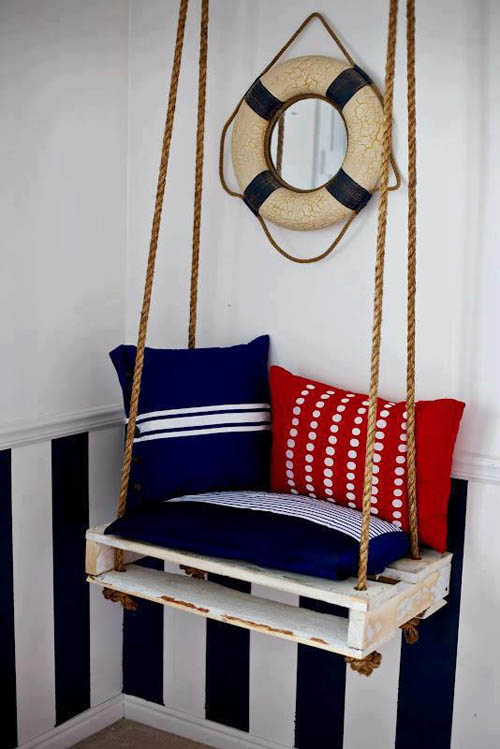 Toque marinero: Solo necesitas cuerda, madera, textiles en colores rojo, blanco y azul. ¿Por qué no hacer un columpio con un palet?,